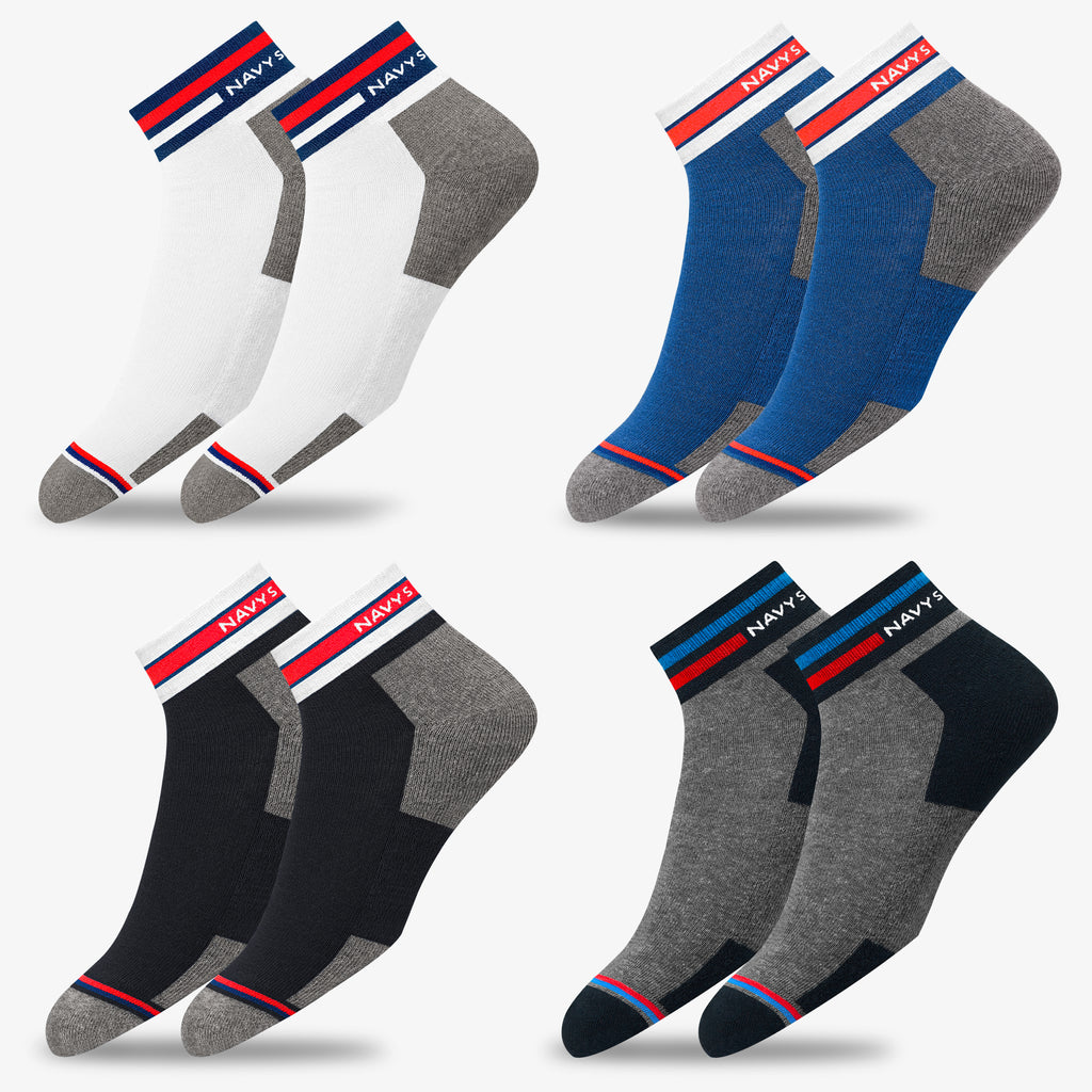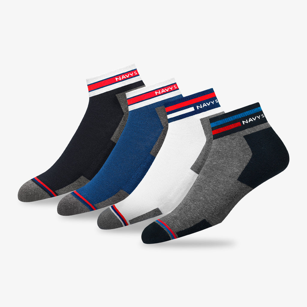 CONTENT : Includes 4 pairs of NAVYSPORT Originals premium combed cotton casual ankle socks with elegant looking signature NAVYSPORT stripes and terry cushioning.
