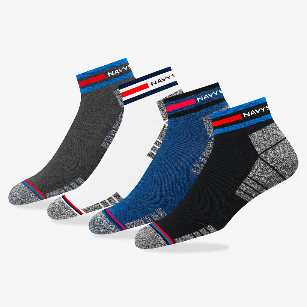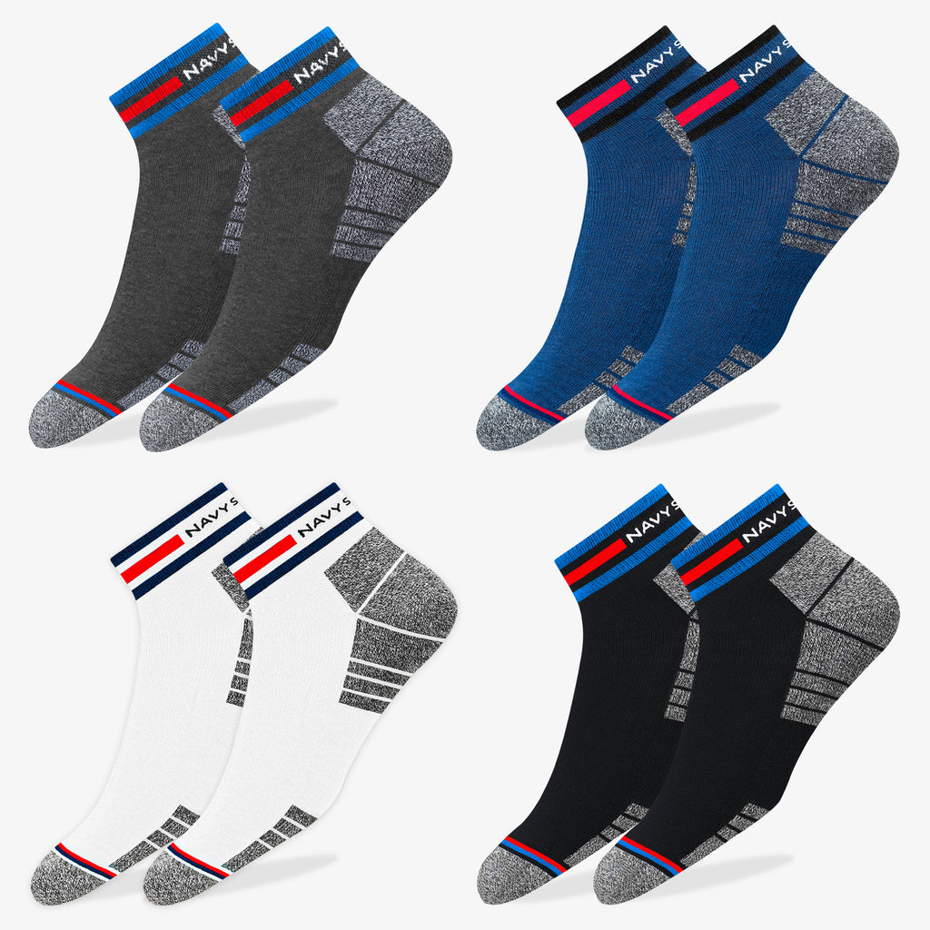 CONTENT : Includes 4 pairs of NAVYSPORT Originals premium combed cotton casual ankle socks with elegant looking signature NAVYSPORT stripes and terry cushioning.